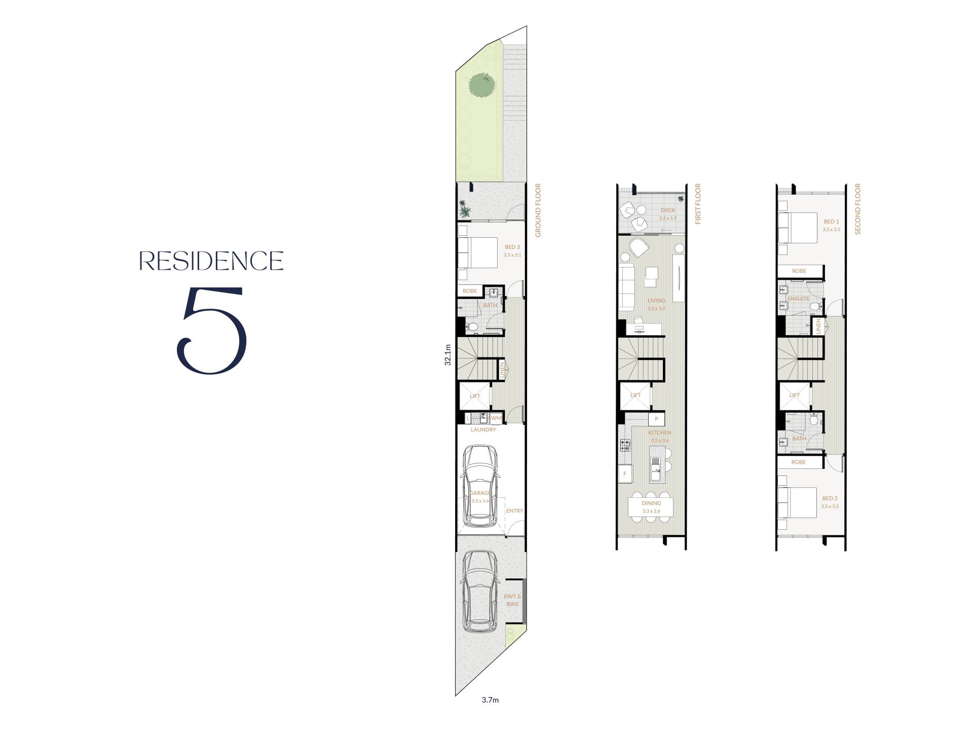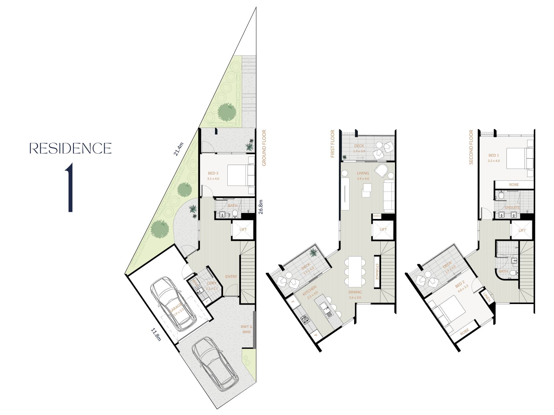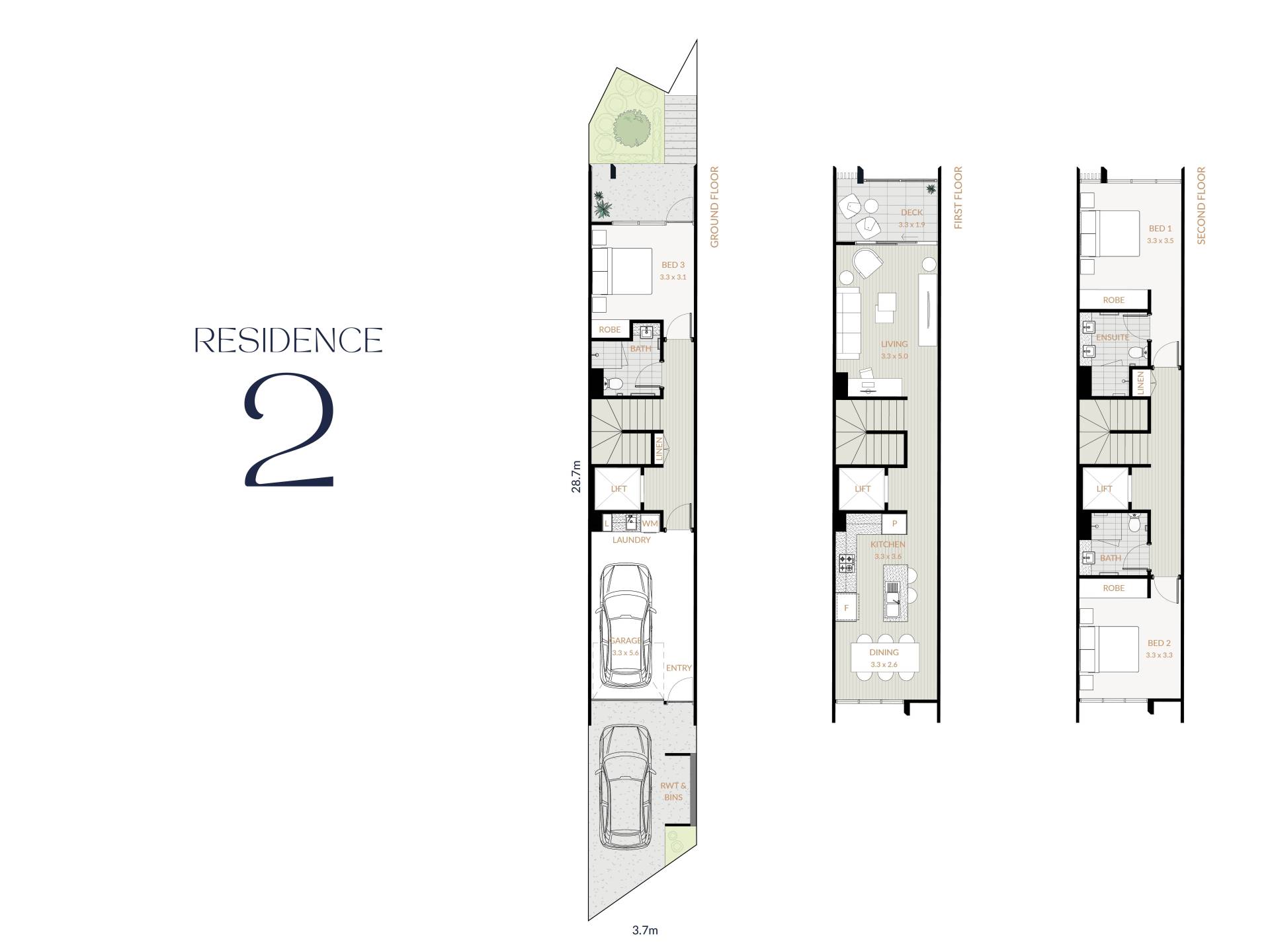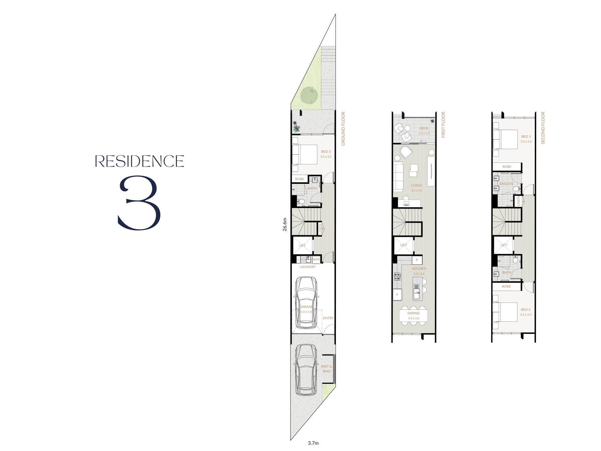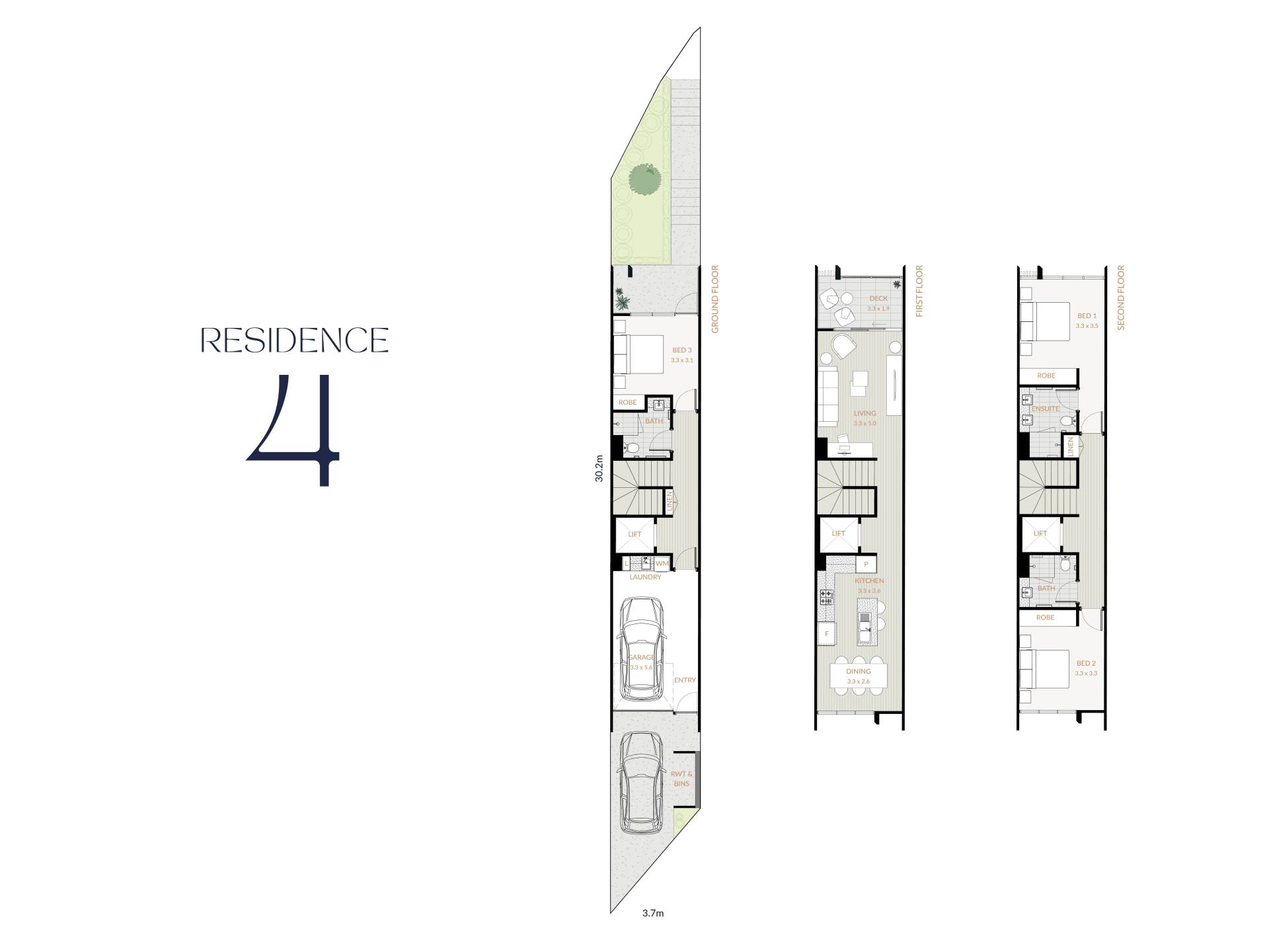 Residences 2-5 feature a well-appointed 3-bedroom design. As you enter the home, take the private lift to the first floor, where the living and entertaining areas await. The L-shaped kitchen, with ample cupboards and a practical island bench, is separated from the living room positioned at the front of the home, opening onto a deck with stunning marina and ocean views. Ascend to the top floor to the private master bedroom and bedroom 2, each with its own bathroom. The ground floor features the third bedroom with direct marina access, a functionally designed laundry, and an additional bathroom, combining sophistication with practical living.