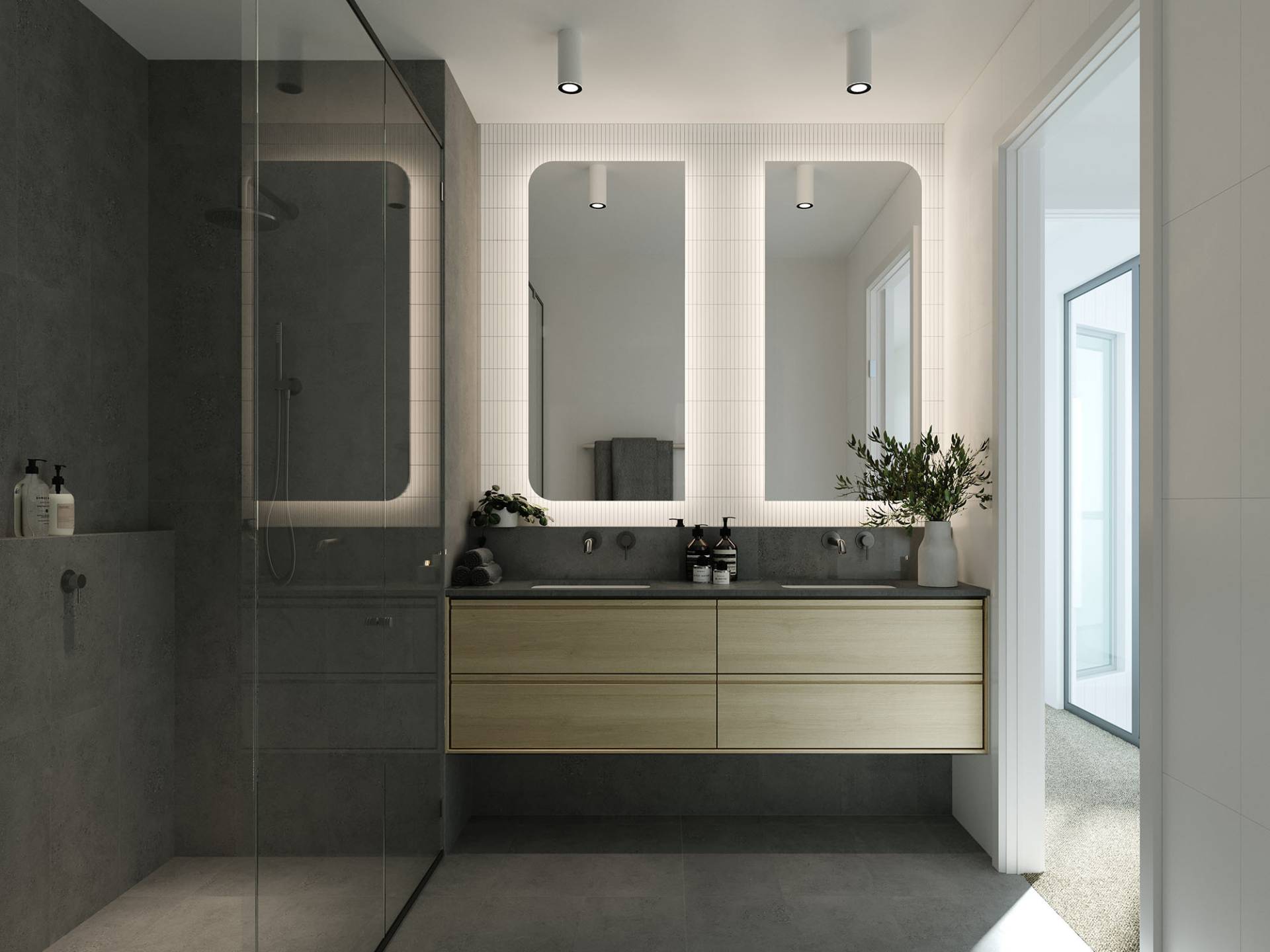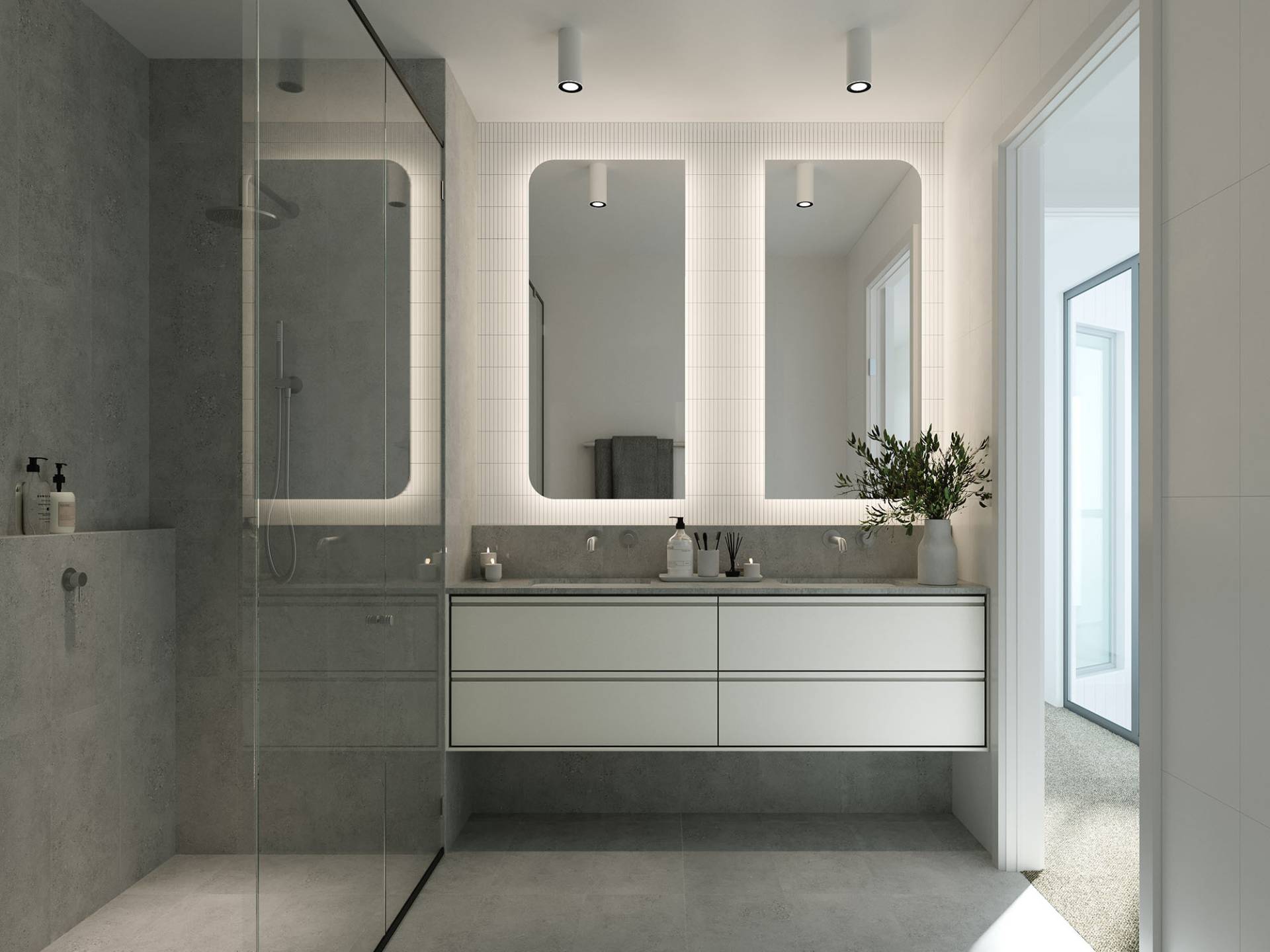-        Bathrooms feature full height tiling, shower nook, high-end cabinetry and tapware, semi-frameless shower screens and the master ensuites all include a double vanity