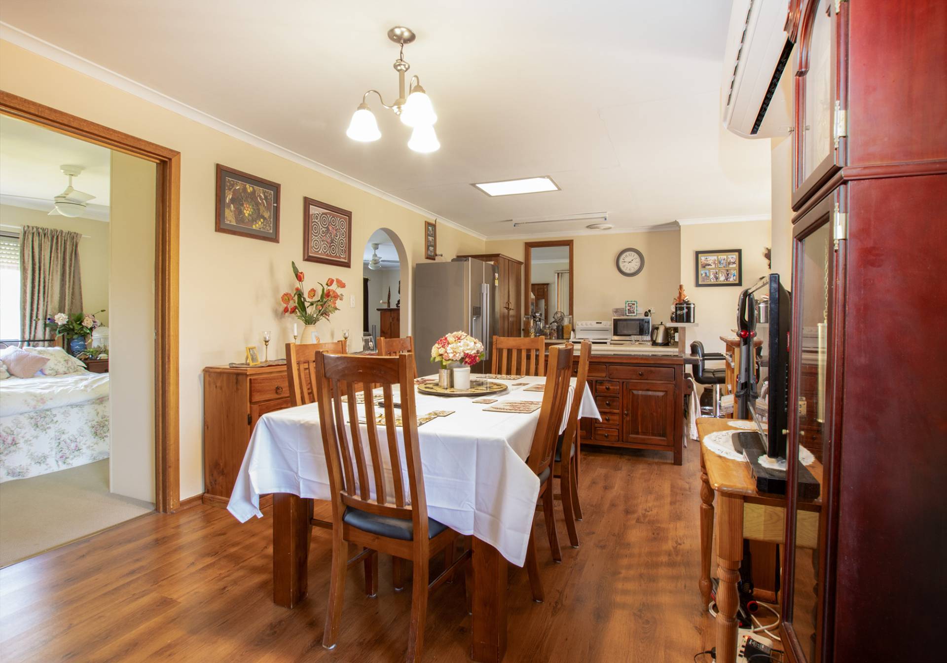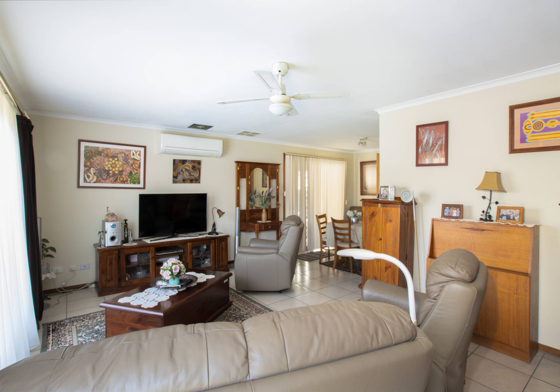 4 bedrooms with all 4 having built-in robes and 3 having ceiling fans, L shaped living and formal dining with c/f and s/s air conditioner, open plan kitchen, family and meals, bathroom with bath, shower and vanity, separate w/c and laundry.