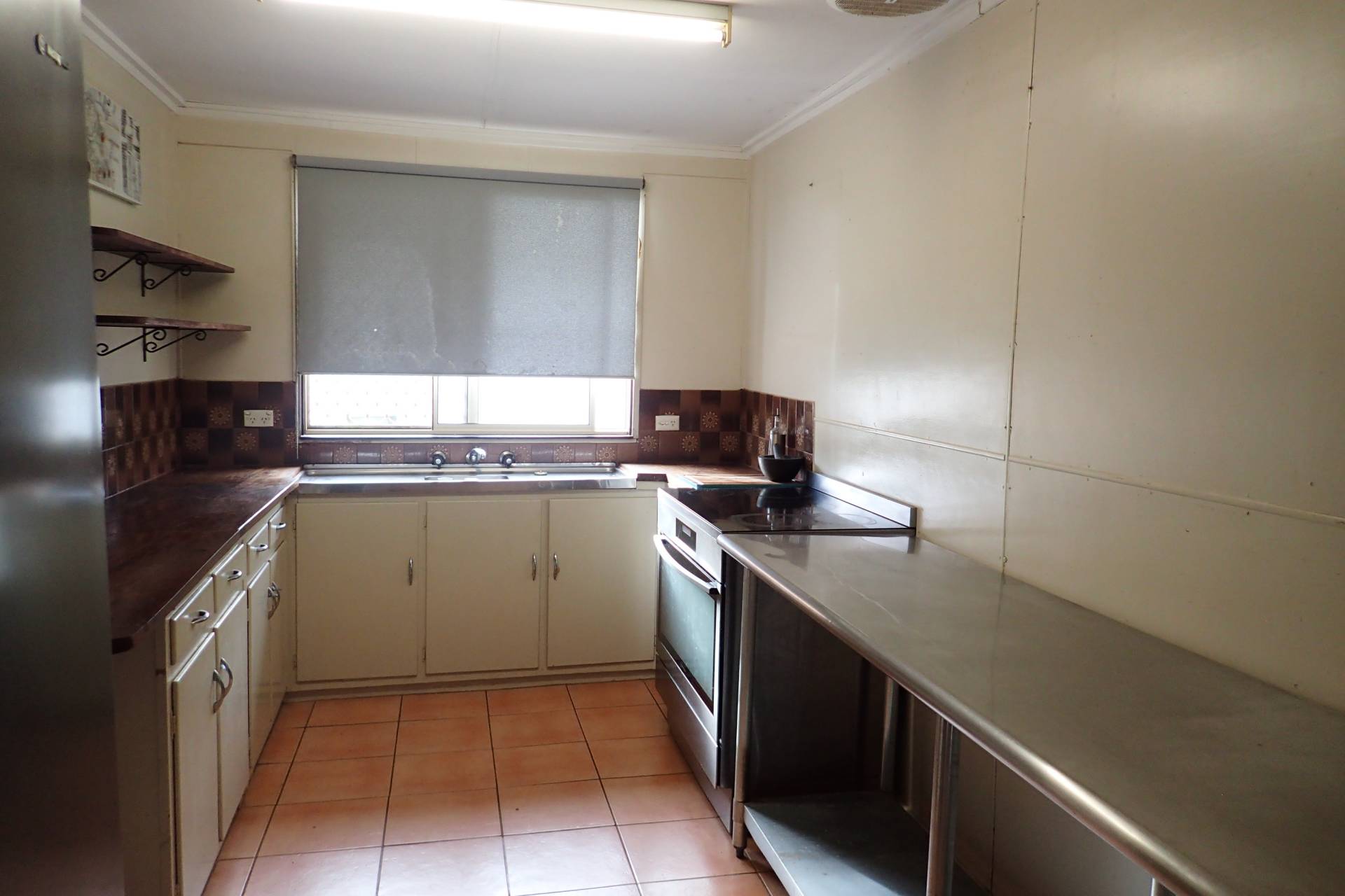 - Galley style kitchen with ample preparation space and a large 900mm freestanding electric oven cooktop
