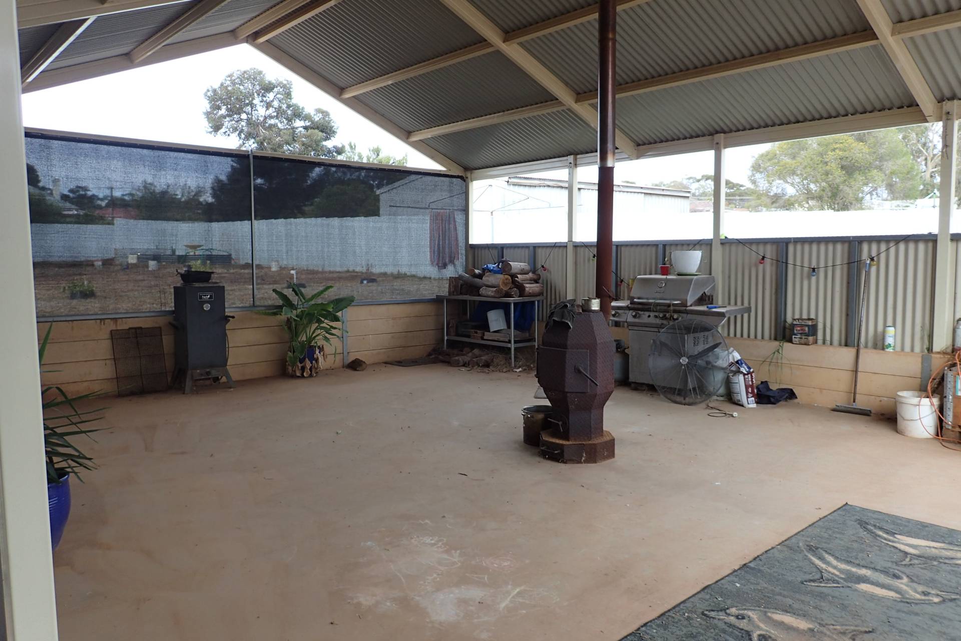 - The major attraction being the large under cover patio area with concrete floor and central potbelly heater with additional zip track blinds for comfort