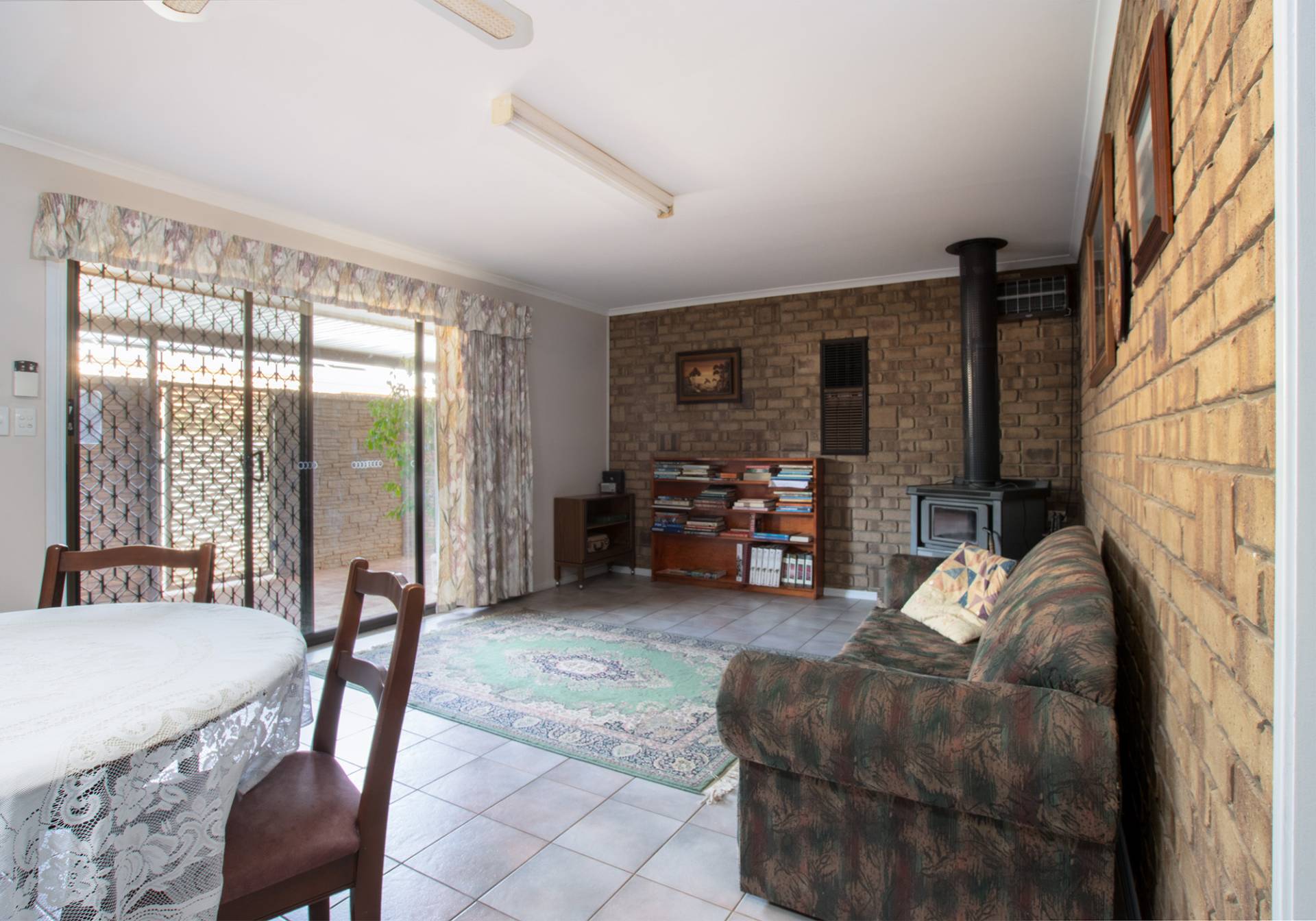 The living room features rustic exposed brickwork, a slow combustion wood heater and a split system AC, all of which enhance the cozy atmosphere throughout the home.