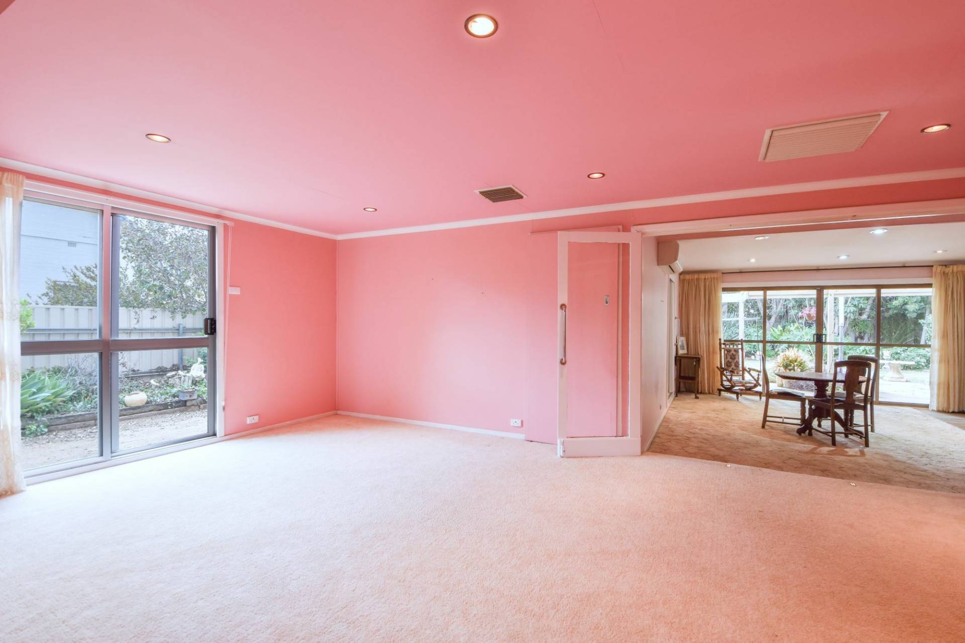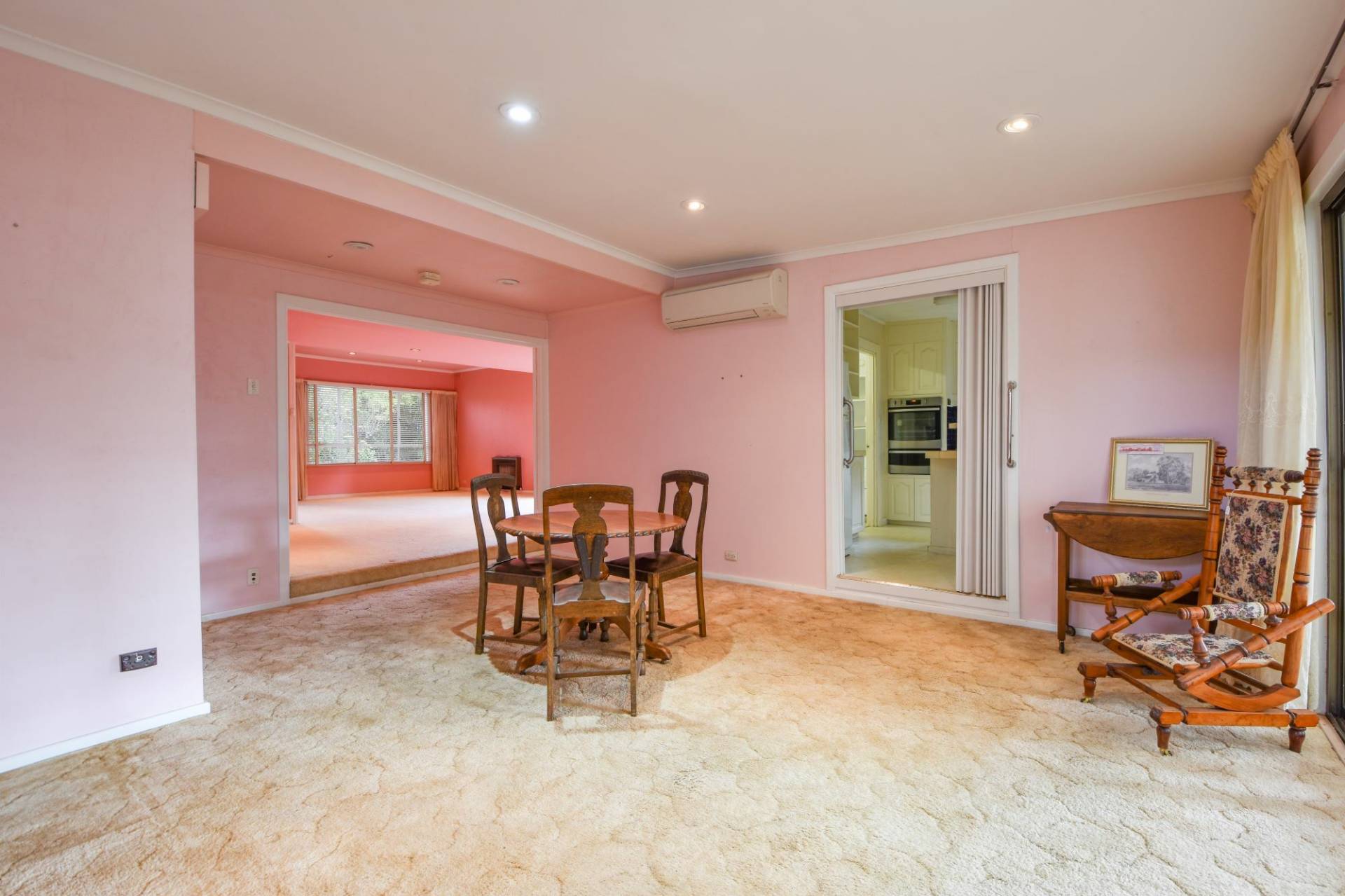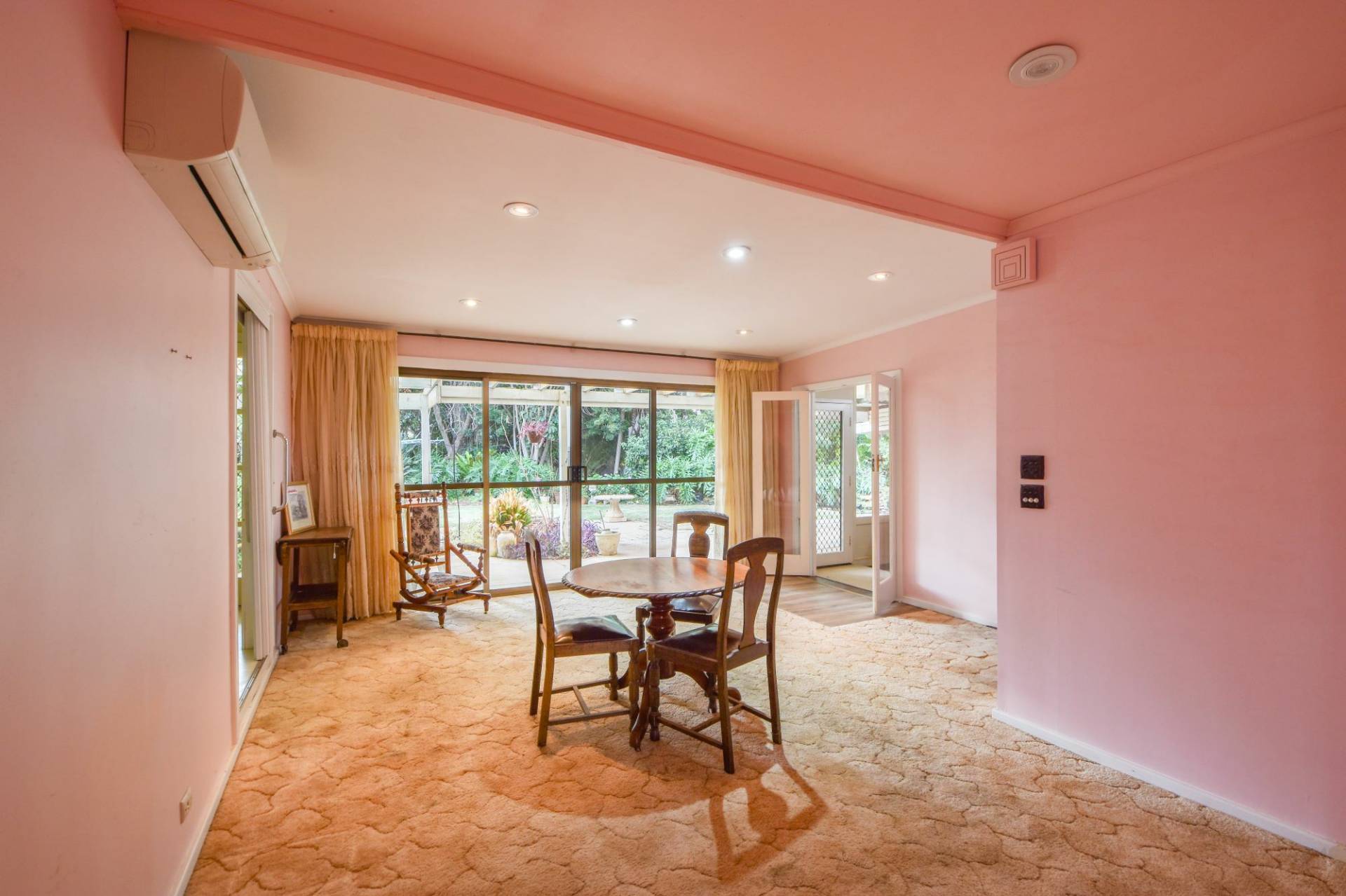 Large living room at the front of the home currently features carpet floors and a pink colour scheme. Step down into the central dining room, which offers double sliding doors leading out to the expansive backyard, perfect for outdoor entertaining and relaxation.