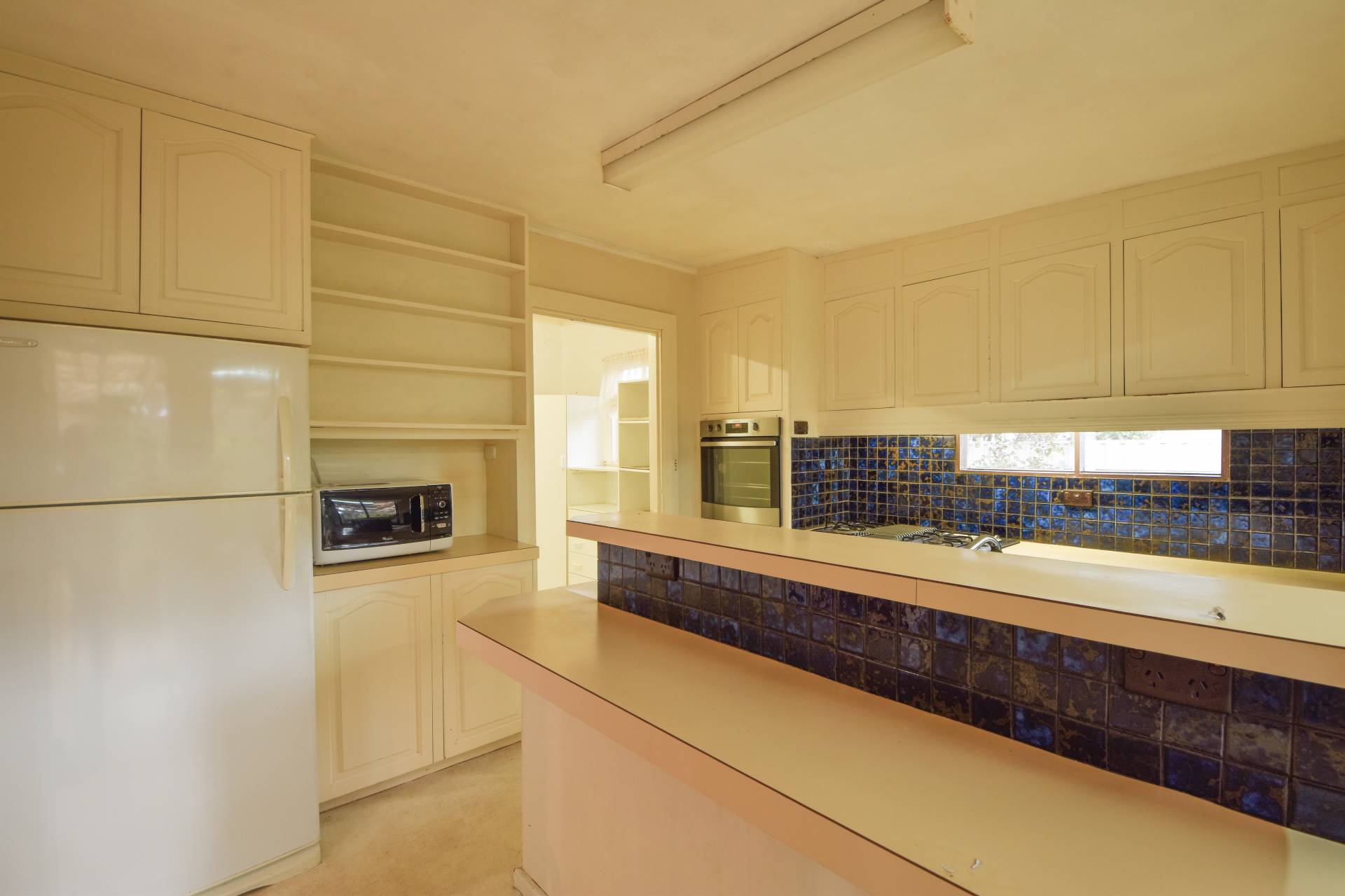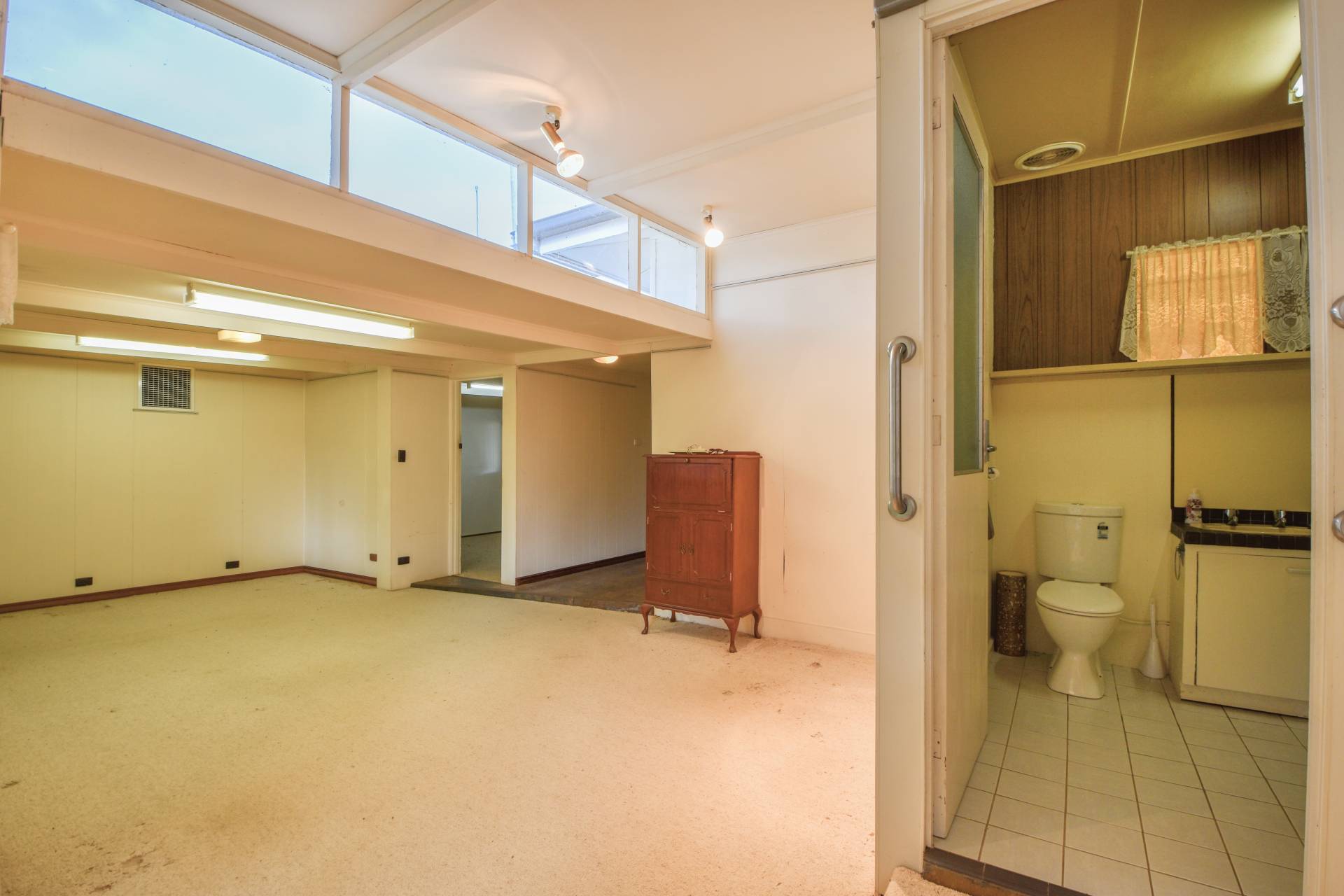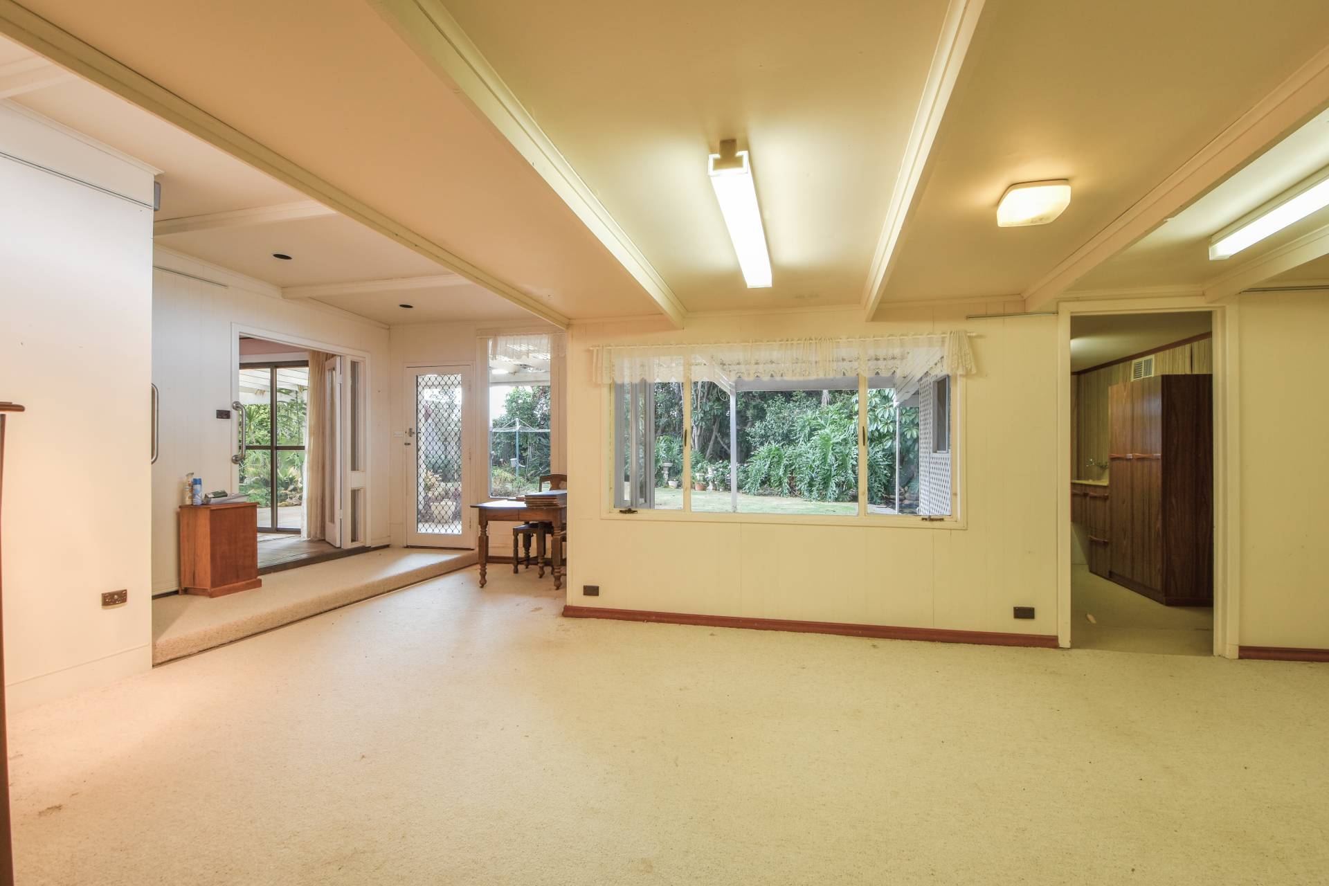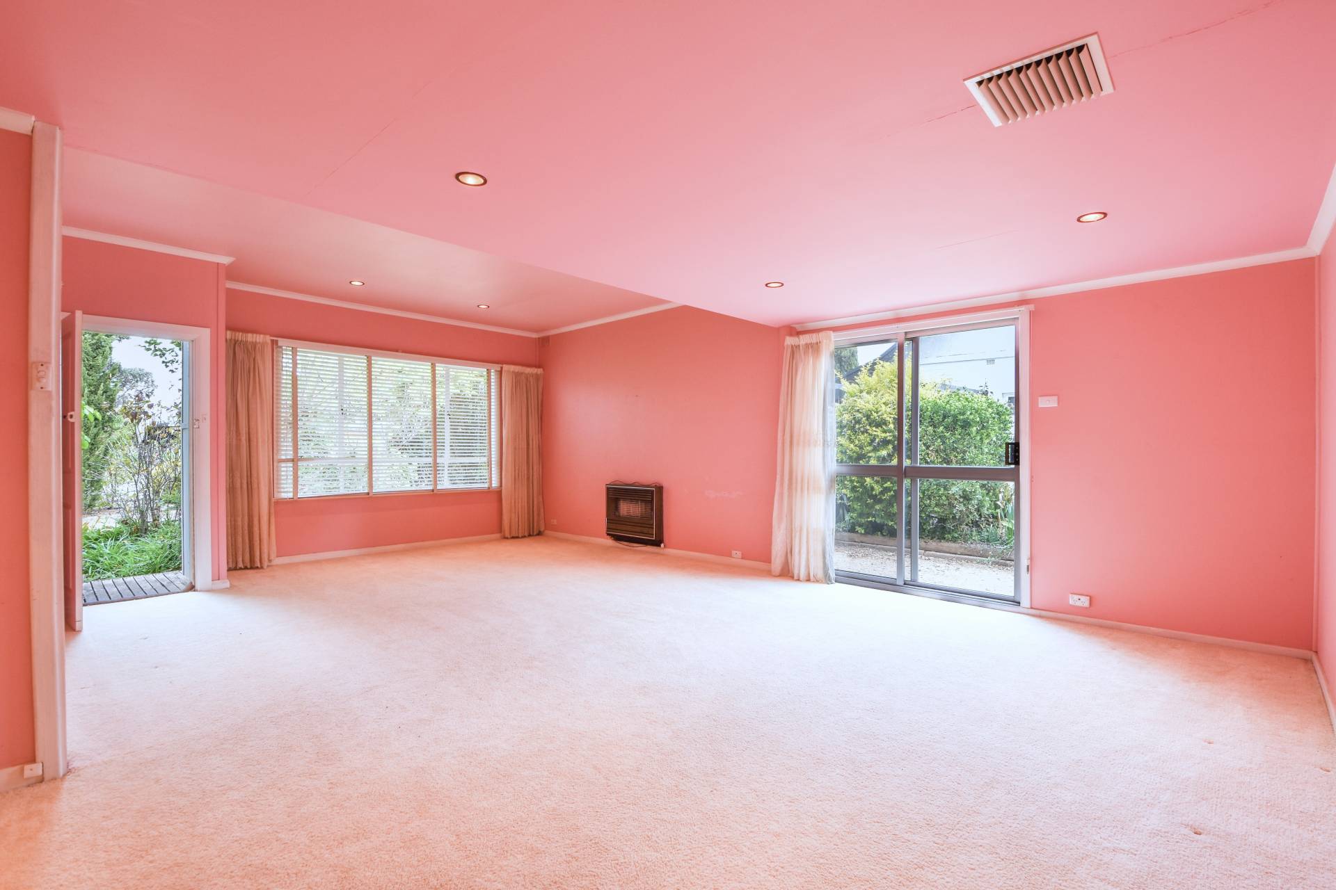 Large living room at the front of the home currently features carpet floors and a pink colour scheme. Step down into the central dining room, which offers double sliding doors leading out to the expansive backyard, perfect for outdoor entertaining and relaxation.