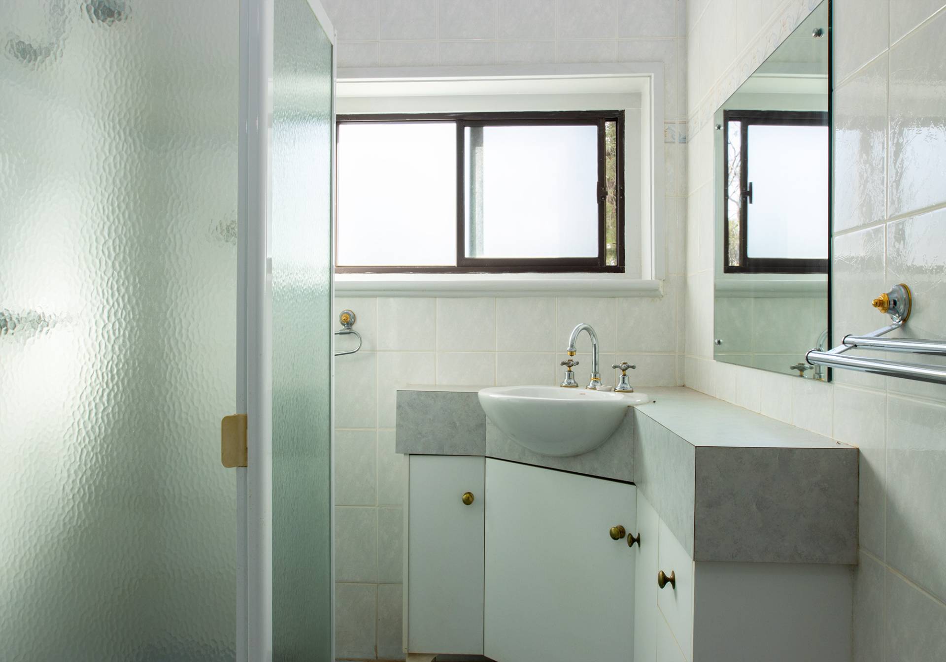 90s style bathroom with shower and vanity.
