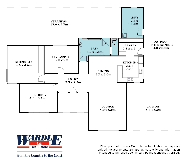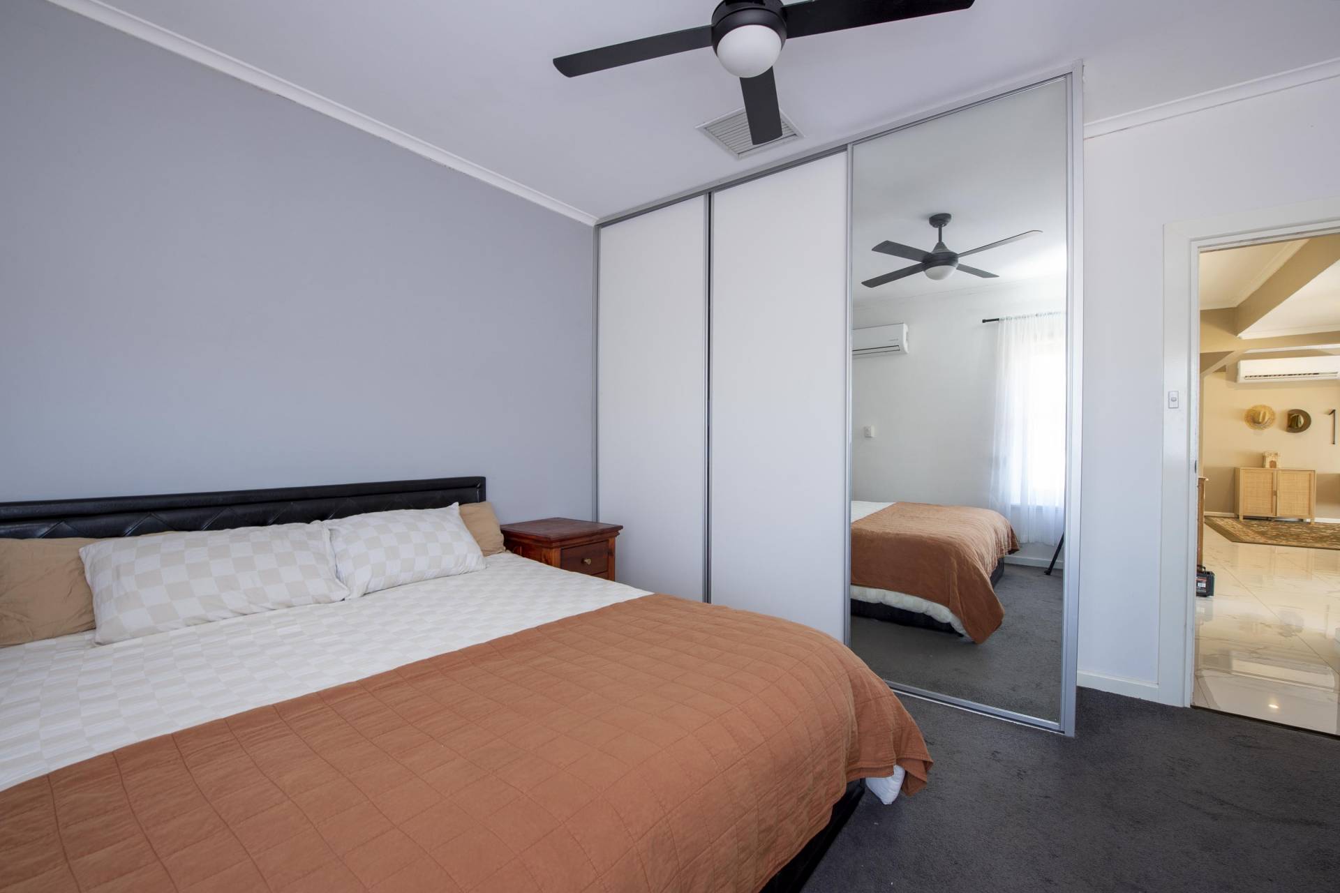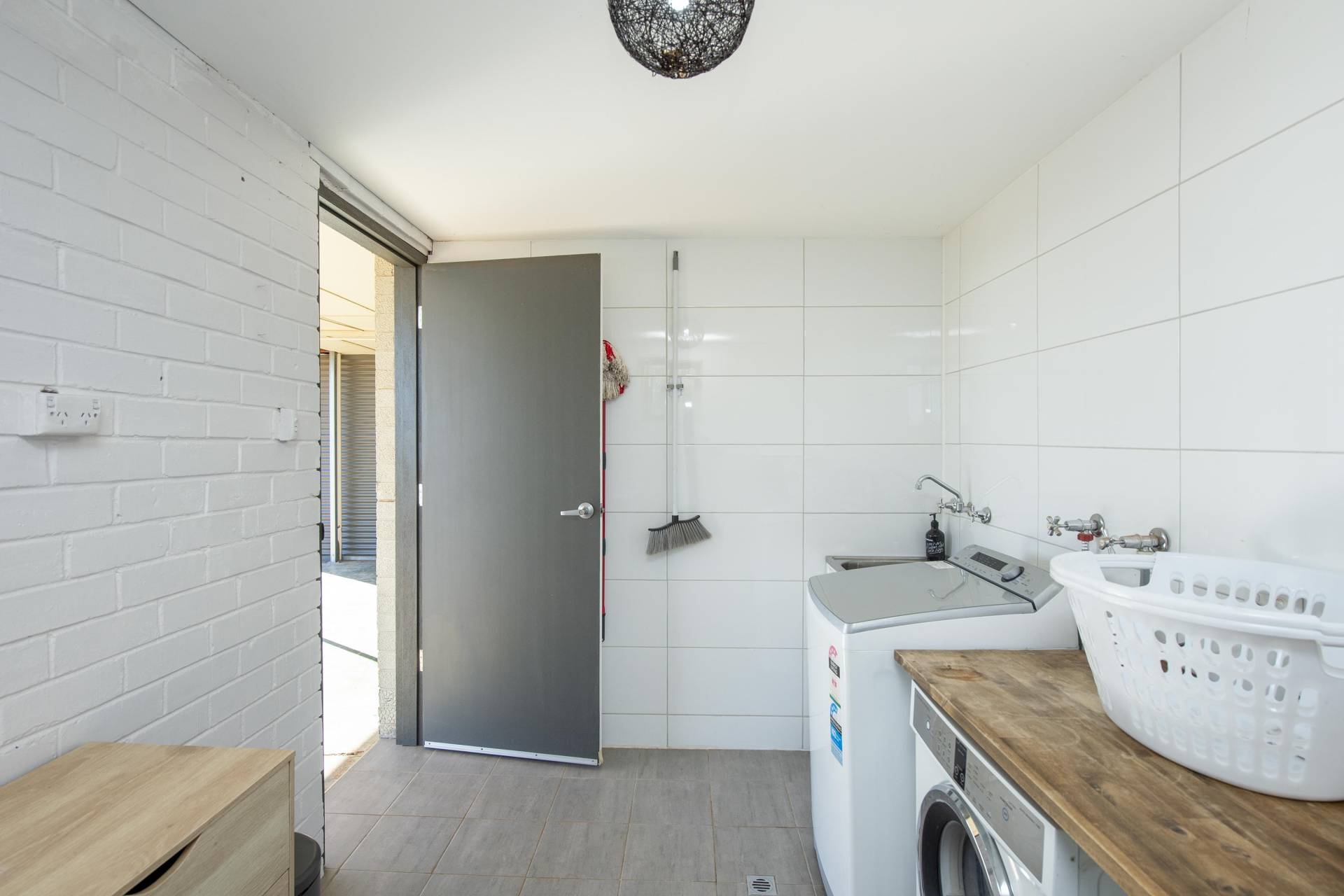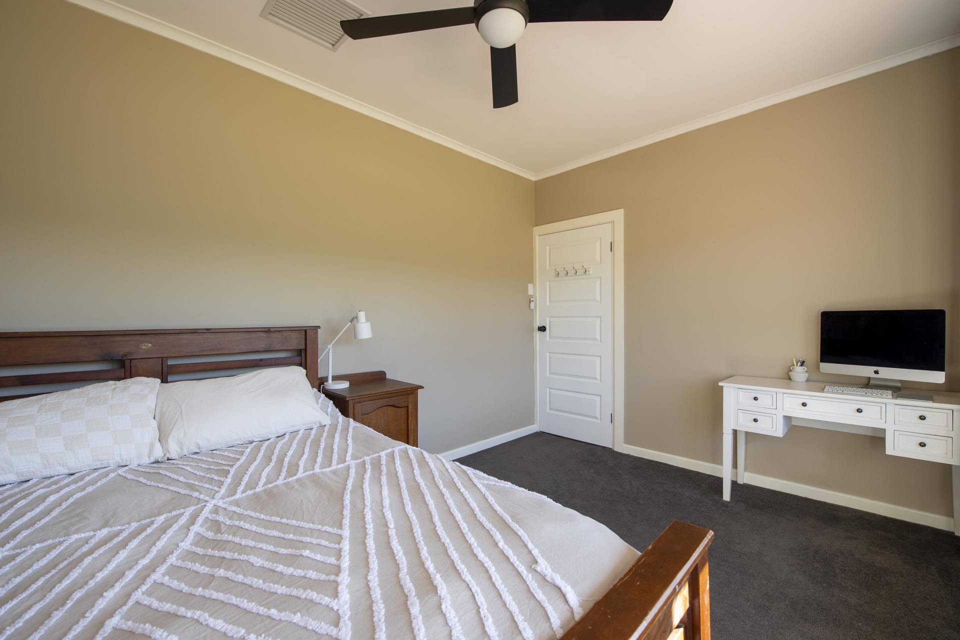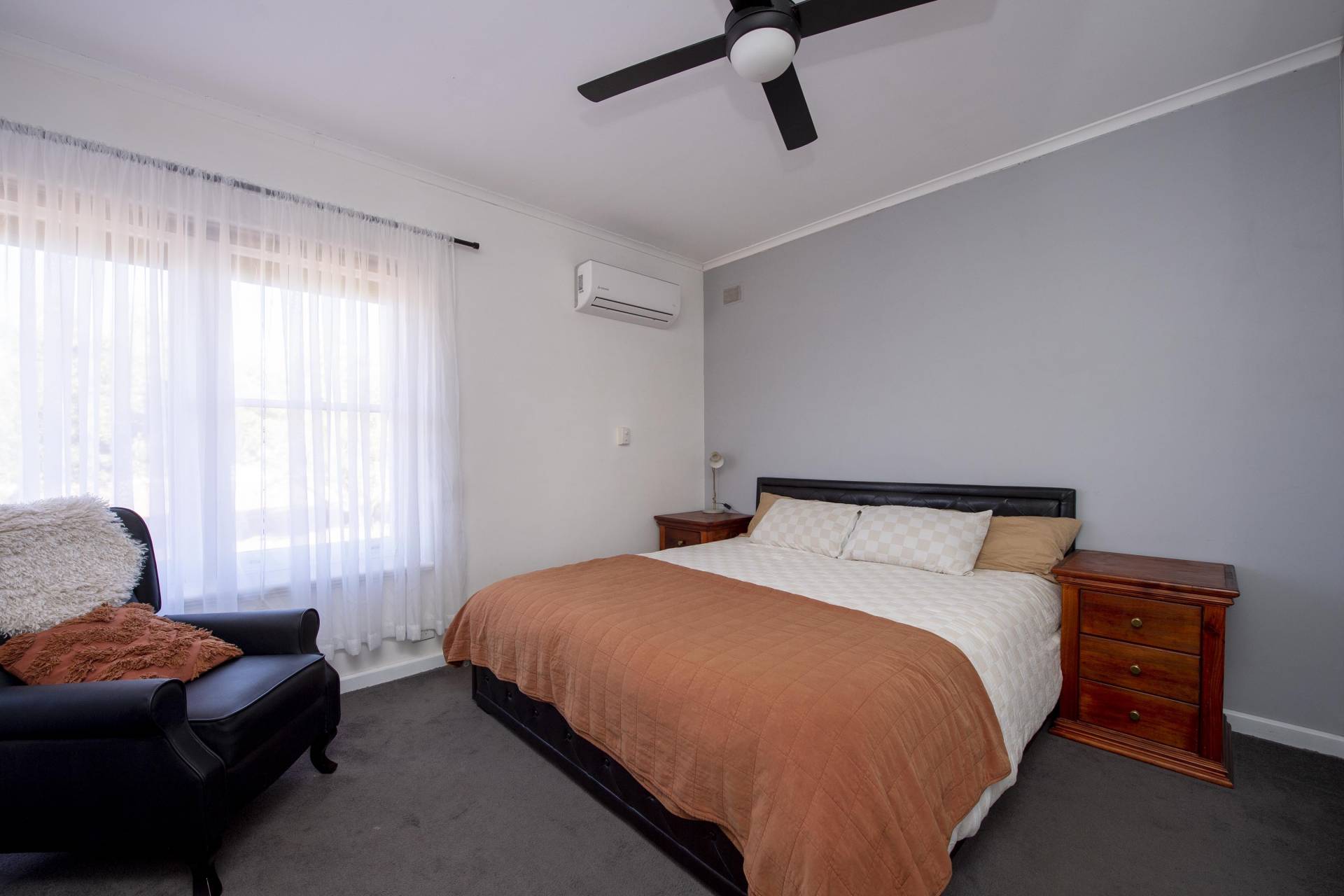The home offers 3 bedrooms, each with ceiling fans and carpet flooring. The main bedroom includes a split system air conditioner and built-in robes for added convenience. The bathroom is spacious and well-appointed, with a bath, shower and separate toilet. The laundry is located to the rear of the home with stainless steel wash trough and white cabinetry.